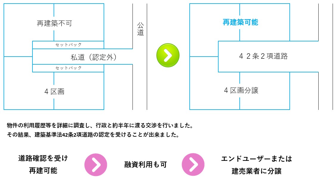 事例:建築基準法上認定外の私道に接した再建不可能な土地を再建可能に